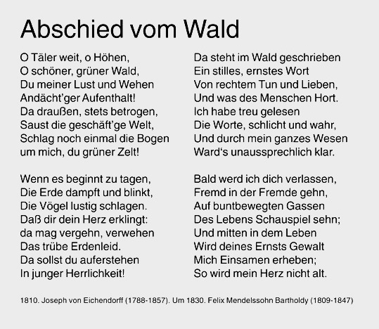 | Brentano und Arnim holten aus der Welt des späten Mittelalters anonyme, mündliche überlieferte Volkslieder in den deutschen Kulturschatz zurück. Die Sammlung unter dem Titel Des Knaben Wunderhorn" mit Weisen voller Phantasie, Sinnlichkeit, innerer Lebenswahrheit und unverfälschter Naturnähe beeinflußte die zeitgenössische wie spätere deutsche Dichtung und Musik. Komponisten wie Mendelssohn Bartholdy und Schubert vertonten viele in der Romantik wiederentdeckte und in romantischer Natur-Begeisterung entstandene Verse. Selbst Liebesglück und Liebesleid sind in diesen Liedern verwoben mit Naturerscheinungen und Naturstimmungen. Reiche Melodik und neuartige Harmonik prägen ihre Instrumentalwerke. | ||